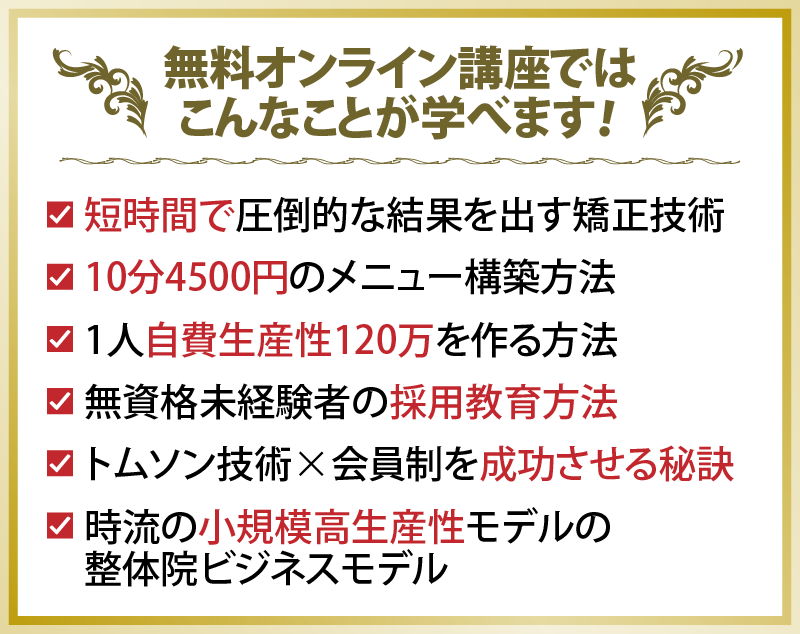 太田式トムソンテクニックは今までのトムソン技術とは全く異なり、施術の理論もしっかりしている為スタッフ全員が再現性が高く成果を出せています。1台だったトムソンベットも今で4台に増え、売上も月売上250万円から600万円まで上がげることが出来ました。