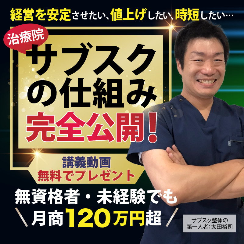 無資格・未経験者の施術者2名で店舗利益率45%を達成。完全サブスク自費会員制を導入し月売上240万〜250万を毎月安定的に確保しています。